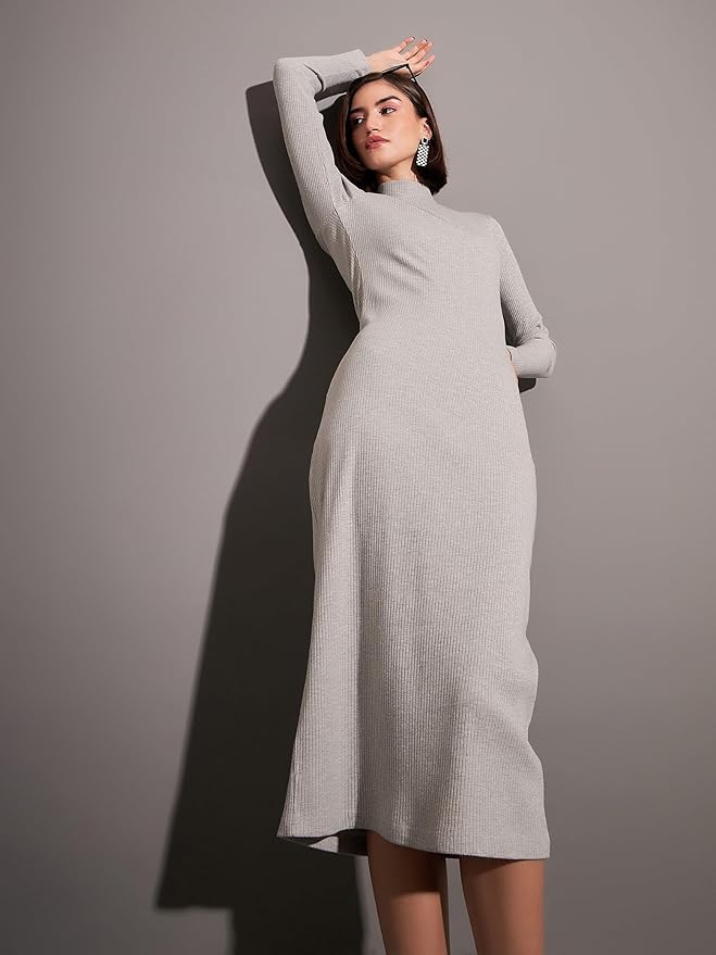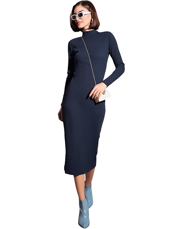 Navy Rib High Neck Maxi Dress, in Rib fabric, Unlined, Midi Length, Bodycon, No Closure, Straight Hemline and features Self Rib Design
